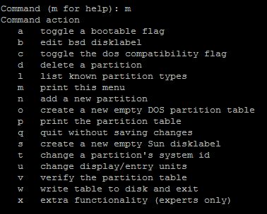 A questo punto dando come comando il valore “m” ci appare il menù dell’utility molto chiaro e user friendly.