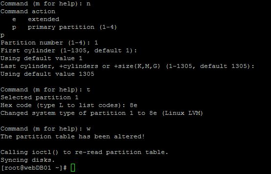 Lo spazio è dunque partizionato, e per impostare la partizione come Linux LVM basta dare il comando “t” e andare a indicare il codice “8e” corrispondente alla formatazione LVM. Per altri formati basta premere il comando “L” e si ha tutta la lista delle opzioni utilizzabili.