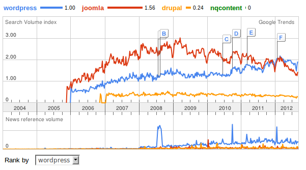 Quello che mi stupisce è però la riduzione del numero dei siti creati in Joomla, sembra infatti aver perso una buona fetta di mercato.
